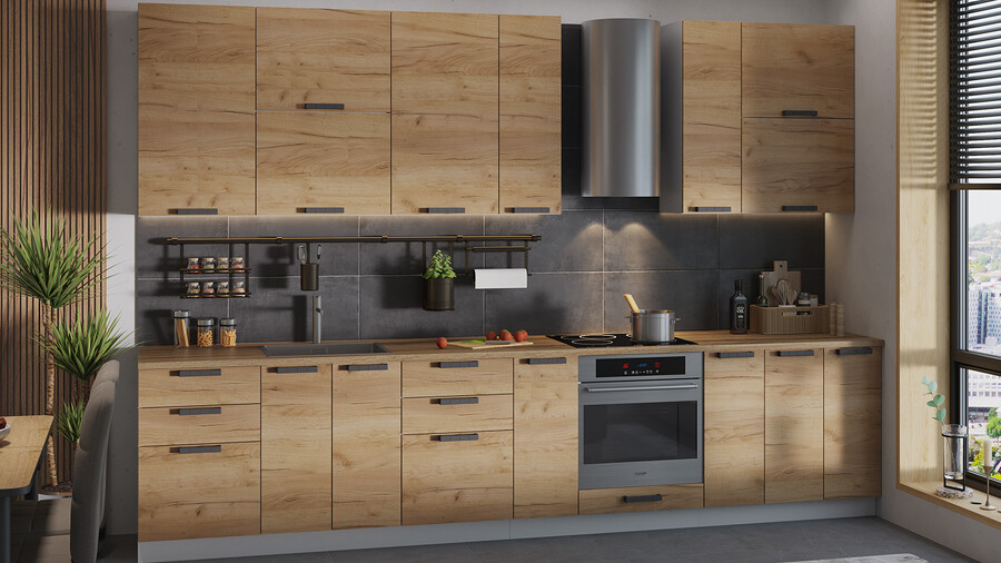 В стоимость не включено: Стеновая панель, столешница, доводчики, бытовая техника, мойка, смеситель, аксессуары