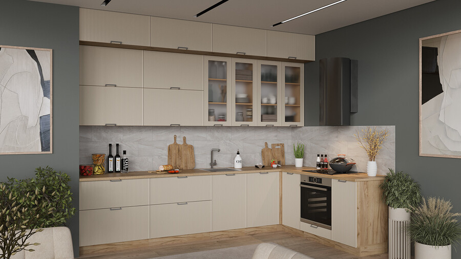 В стоимость не включено: Стеновая панель, столешница, доводчики, бытовая техника, мойка, смеситель, аксессуары