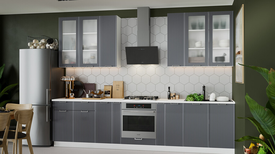 В стоимость не включено: Стеновая панель, столешница, доводчики, бытовая техника, мойка, смеситель, аксессуары