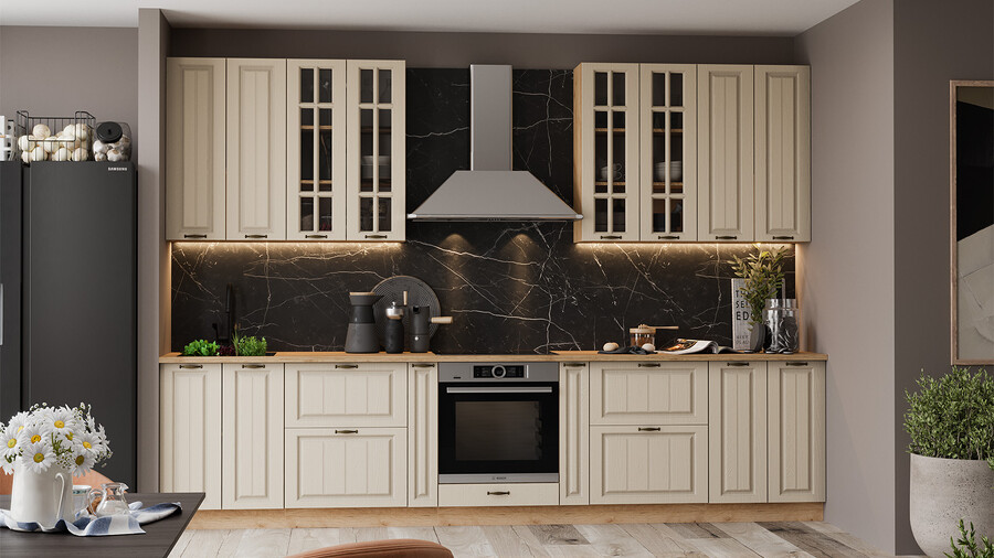 В стоимость не включено: Стеновая панель, столешница, доводчики, бытовая техника, мойка, смеситель, аксессуары