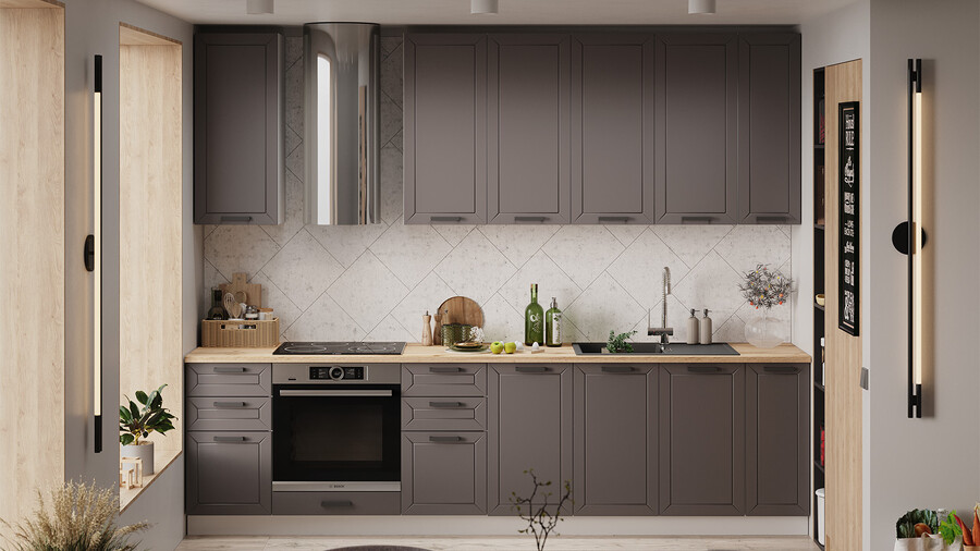 В стоимость не включено: Стеновая панель, столешница, доводчики, бытовая техника, мойка, смеситель, аксессуары