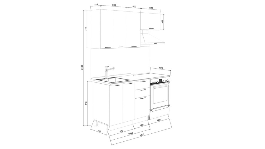 Габаритный размер готового набора модулей с учетом газовой плиты на 60 см: 160 см.