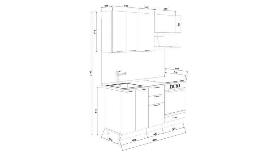 Габаритный размер готового набора модулей с учетом газовой плиты на 60 см: 160 см.