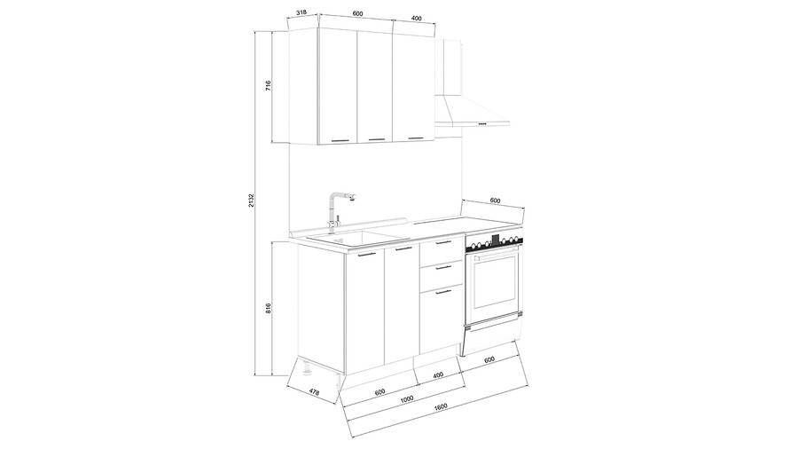 Габаритный размер готового набора модулей с учетом газовой плиты на 60 см: 160 см.