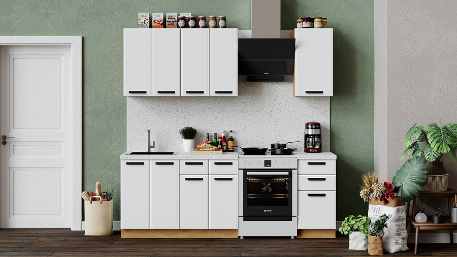В стоимость не включено: Стеновая панель, столешница, доводчики, бытовая техника, мойка, смеситель, аксессуары