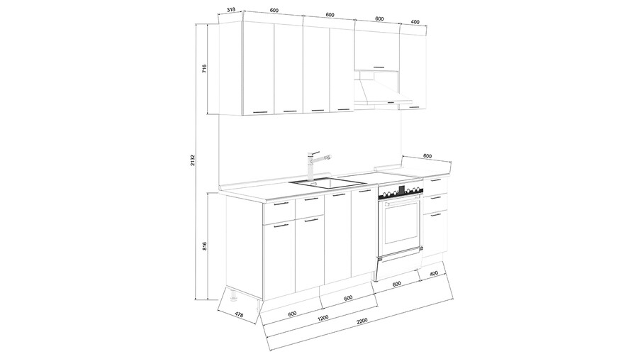 Габаритный размер готового набора модулей с учетом газовой плиты на 60 см: 220 см.