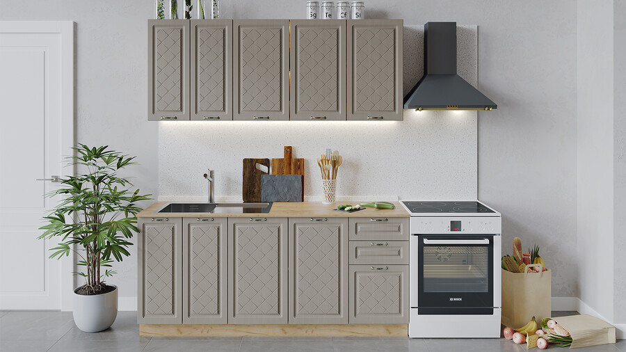 В стоимость не включено: Стеновая панель, столешница, доводчики, бытовая техника, мойка, смеситель, аксессуары