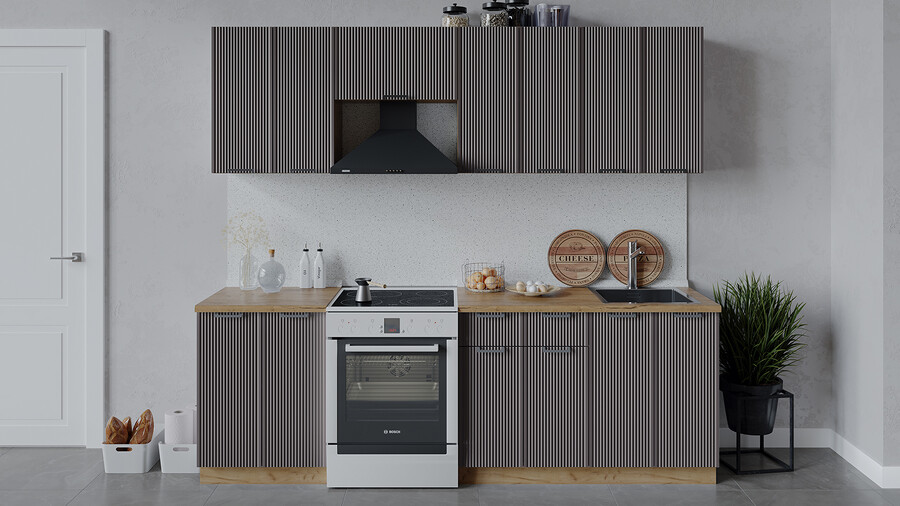 Габаритный размер готового набора модулей с учетом газовой плиты на 60 см: 240 см.