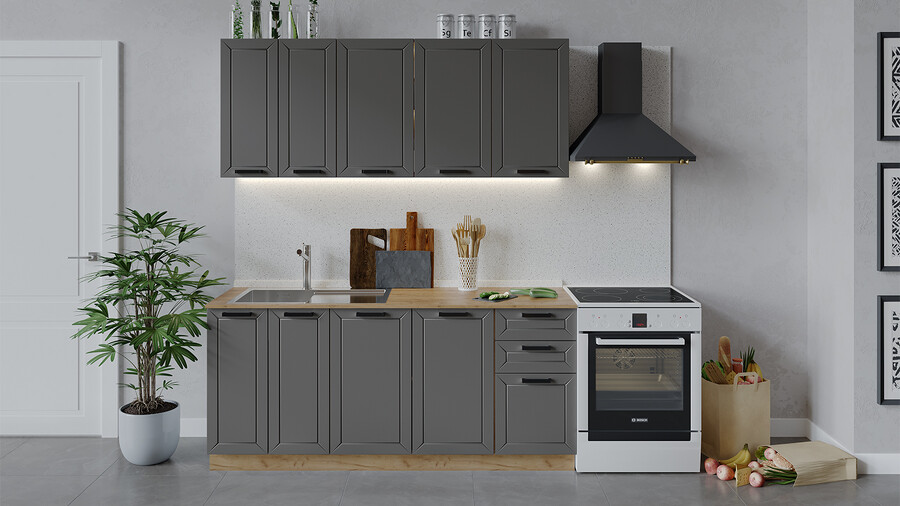 Габаритный размер готового набора модулей с учетом газовой плиты на 60 см: 240 см.