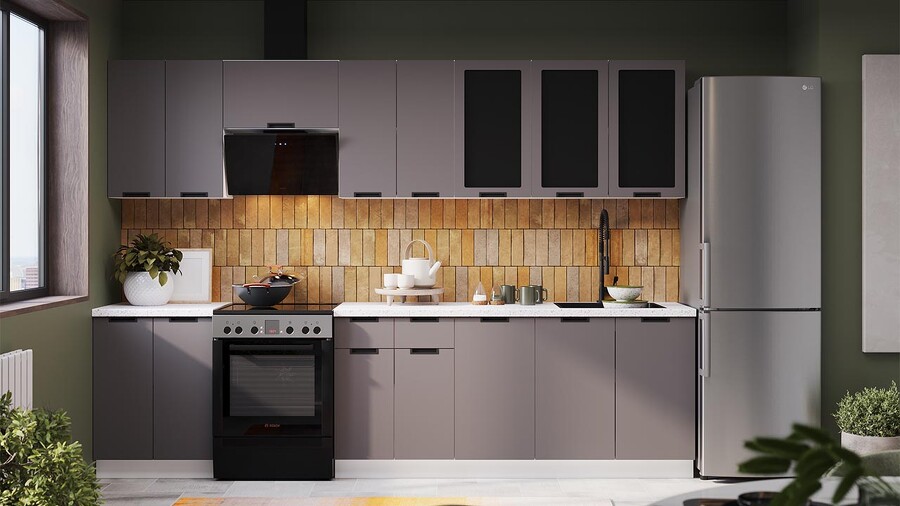 В стоимость не включено: Стеновая панель, столешница, доводчики, бытовая техника, мойка, смеситель, аксессуары