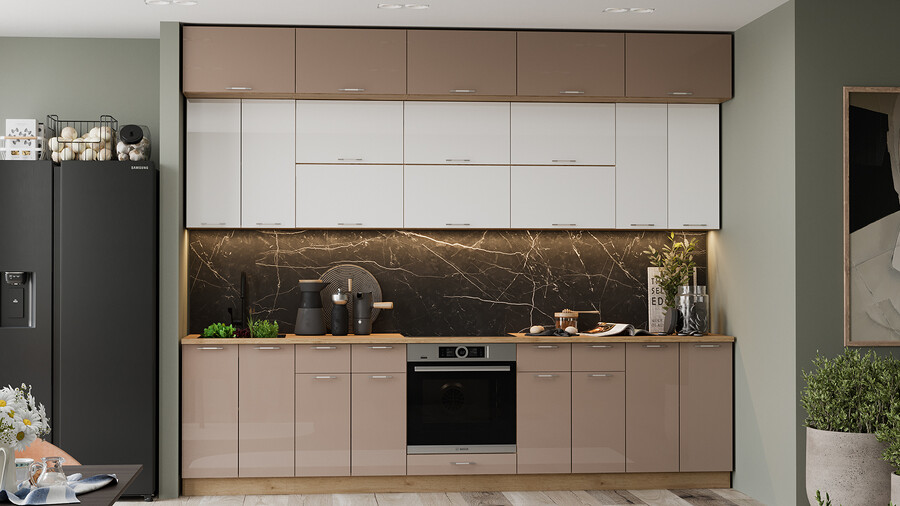 В стоимость не включено: Стеновая панель, столешница, доводчики, бытовая техника, мойка, смеситель, аксессуары