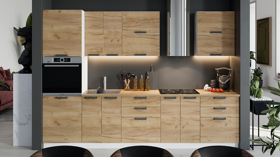 Габаритный размер готового набора модулей с учетом газовой плиты на 60 см: 300 см.