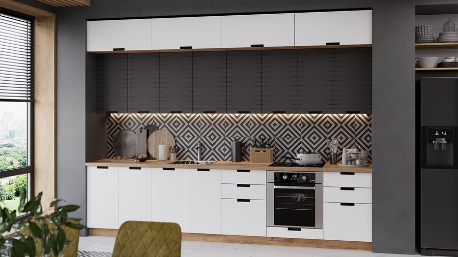 В стоимость не включено: Стеновая панель, столешница, доводчики, бытовая техника, мойка, смеситель, аксессуары
