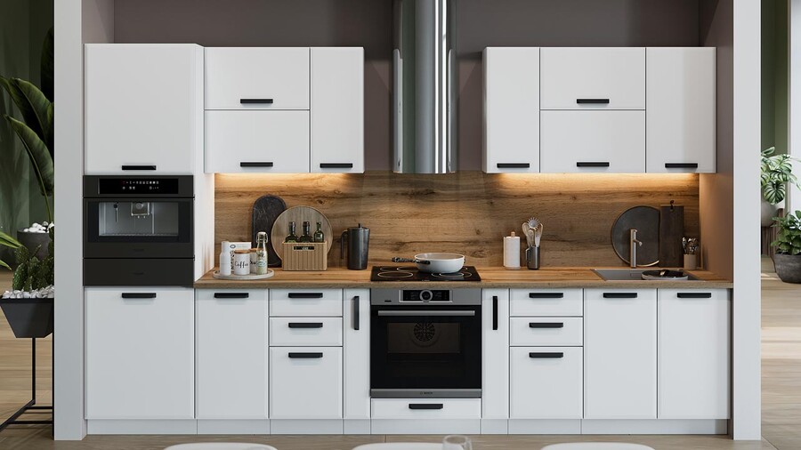 В стоимость не включено: Стеновая панель, столешница, доводчики, бытовая техника, мойка, смеситель, аксессуары