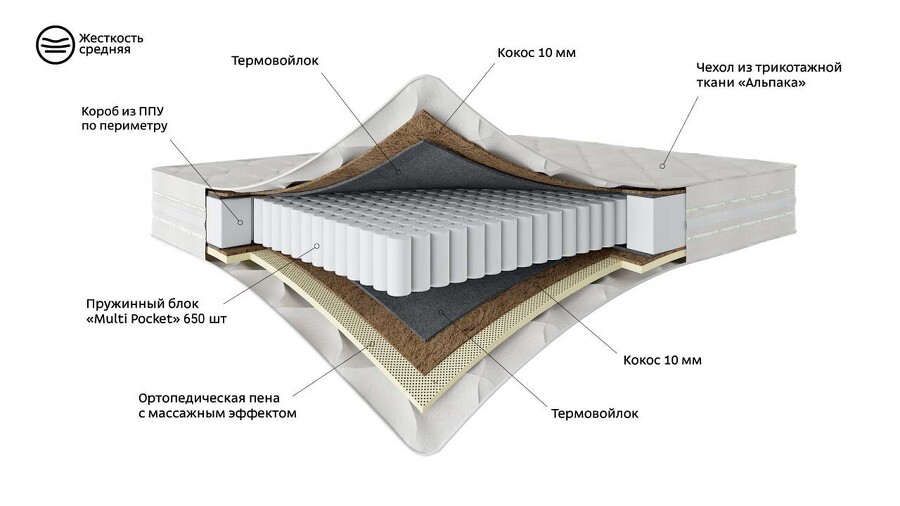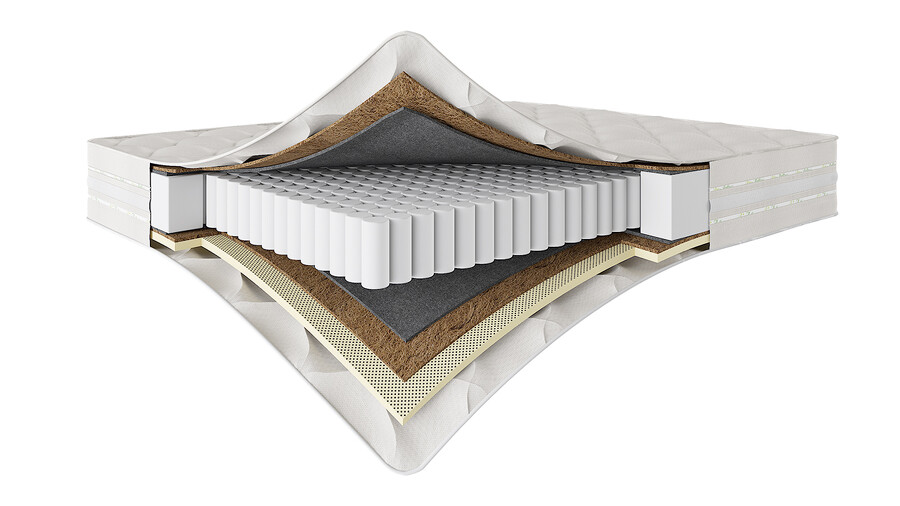 ППУ, независимый пружинный блок, термовойлок, кокос, ортопедическая пена с массажным эффектом