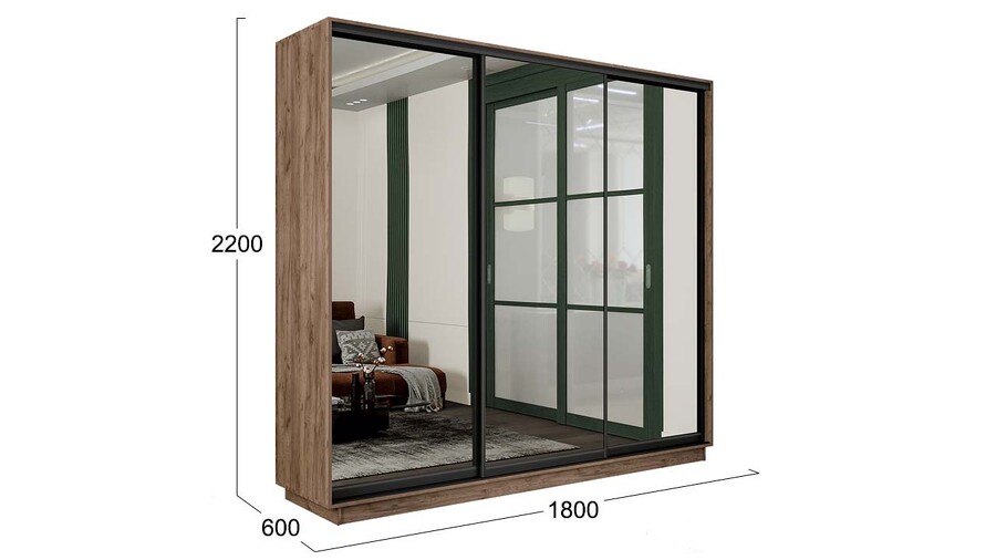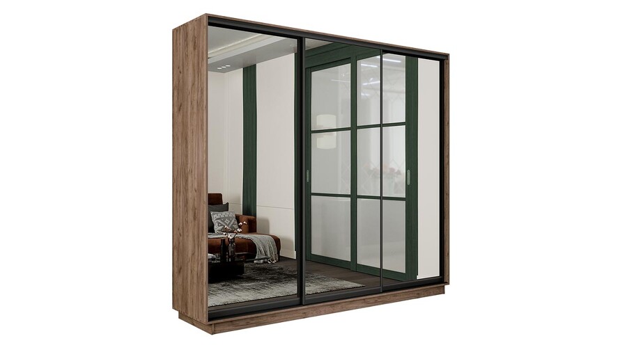 Шкаф-купе 3-х дверный «Румер-2» - СШК 3.180.60-13.13.13(Н) Дуб Крафт Табачный, Зеркало, Черный профиль