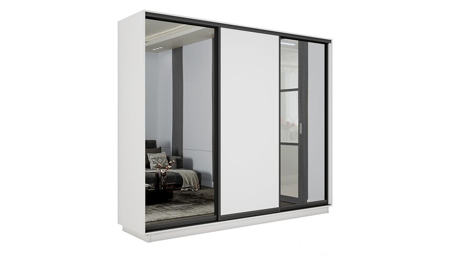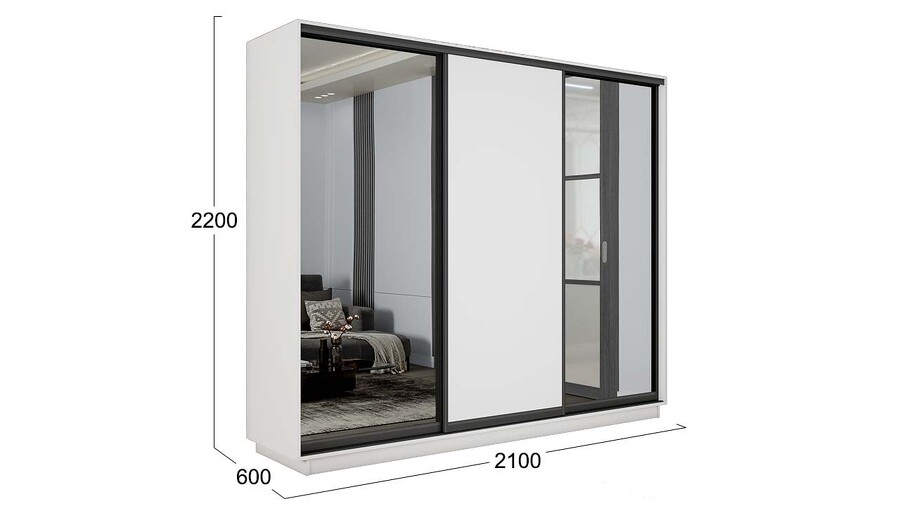Шкаф-купе 3-х дверный «Румер-2» - СШК 3.210.70-13.11.13(Н) Белый снег, Зеркало, Черный профиль