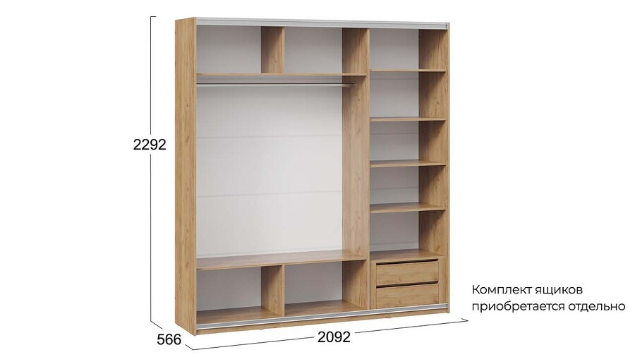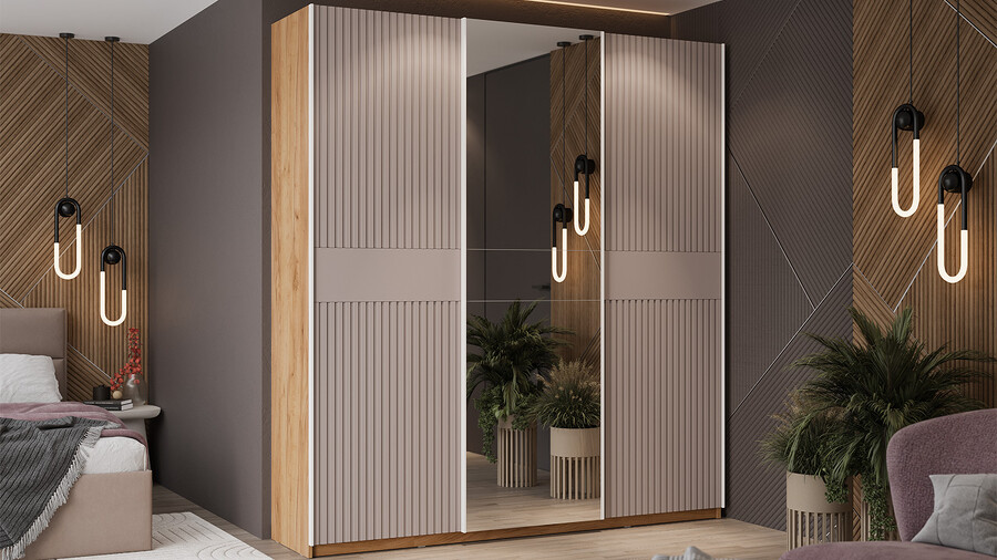 Шкаф-купе с 2 глухими и 1 зеркальной дверями «Оскар Хилтон» Ручка белая, Дуб Крафт золотой, Кашемир, Кашемир сатин