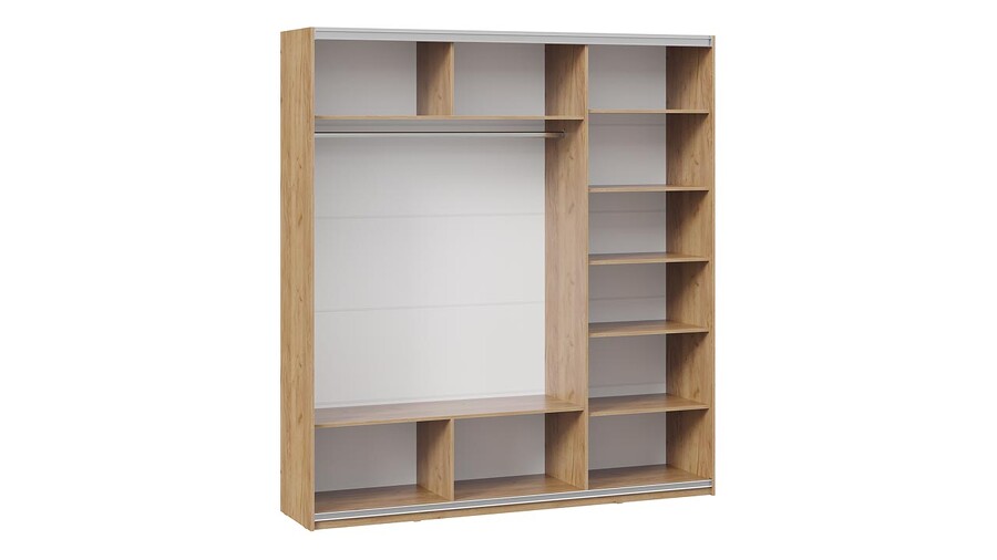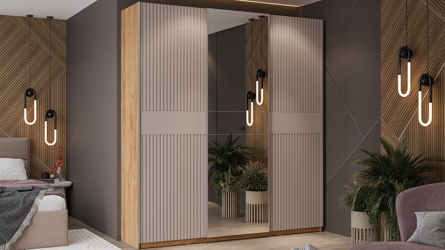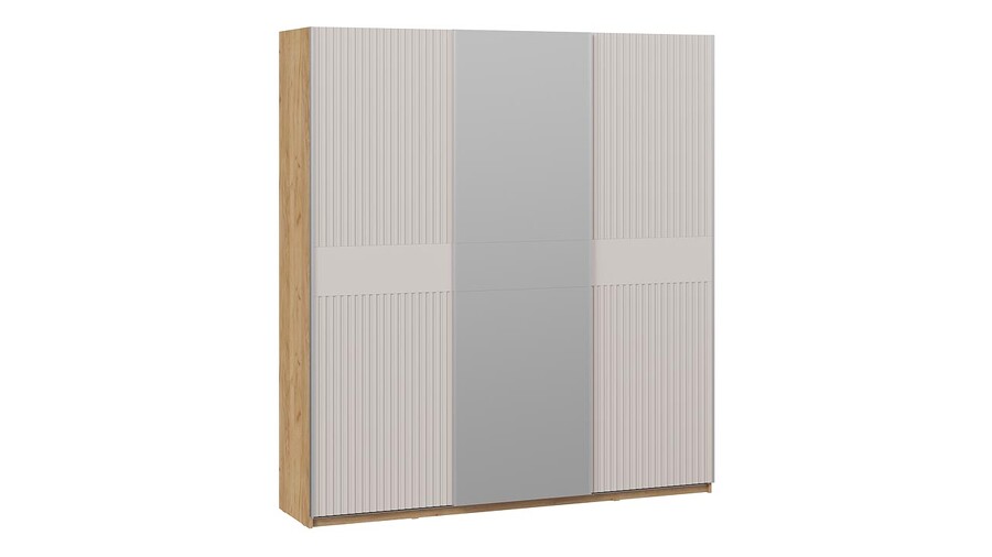 Шкаф-купе с 2 глухими и 1 зеркальной дверями «Оскар Хилтон» Ручка серебро, Дуб Крафт золотой, Кашемир, Кашемир сатин