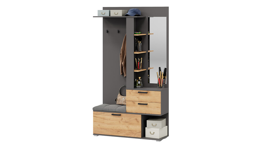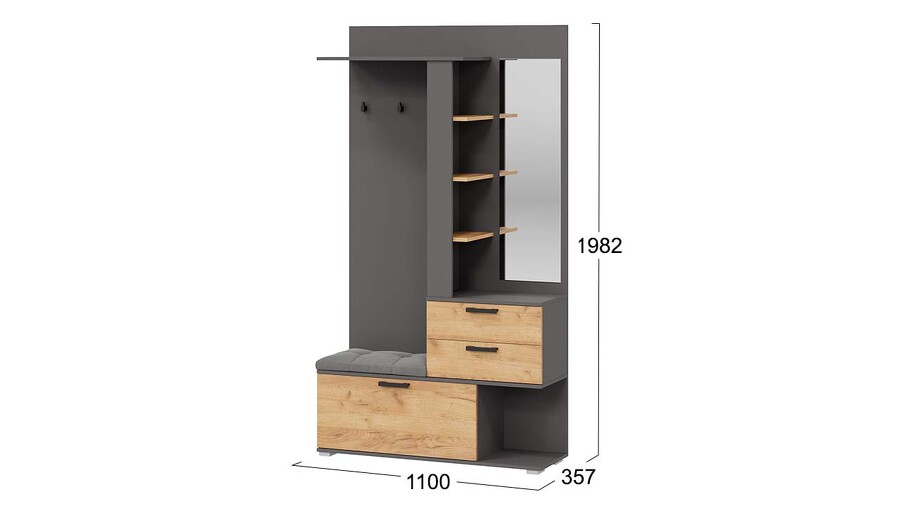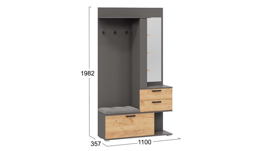 Вешалка комбинированная с крючками и зеркалом «Эрика» Тип 2 Графит Серый, Дуб Крафт золотой