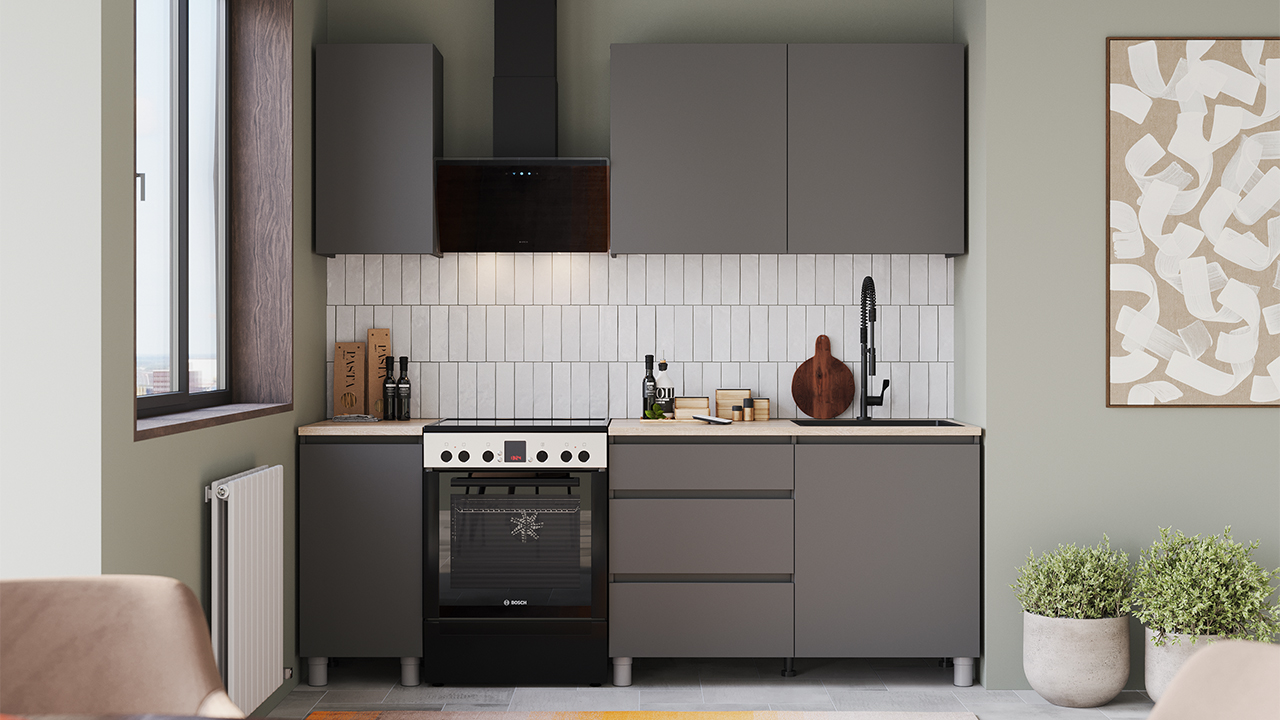 Изысканный дизайн и функциональность. Особый шик и узнаваемость кухне придаёт актуальный благородный декор «Графит серый», который прекрасно сочетается со многими цветами и прежде всего, привносит интерьеру элегантности. Фасады шкафов накладные и не имеют лицевой фурнитуры, что придает гарнитуру современный и стильный вид. Дверцы и ящики открываются захватом руки за выступающий край. Такое решение облегчает уход за поверхностью и делает гарнитур более комфортным. Кухонный гарнитур не имеет цоколя, впереди устанавливаются декоративные регулируемые опоры 100 мм, они позволяют компенсировать небольшие перепады высоты и неровности пола. Оптимально подобранные элементы организуют удобную систему хранения даже на небольшой кухне. Кухонный гарнитур в размере 1,6 м состоит из двух напольных и двух навесных модулей. Напольные модули представляют собой комбинированный стол шириной 1200 мм, одна половина которого - отсек для хранения с тремя ящиками, а вторая половина предназначена для установки мойки и стол с полкой шириной 400 мм. Навесные модули — это шкаф шириной 1200 мм с двумя отсеками для хранения с полками посередине с распашными створками и шкаф с полкой шириной 400 мм с распашной створкой