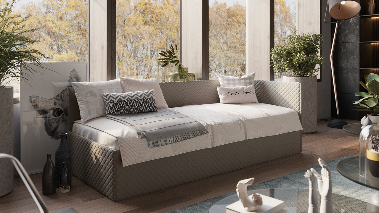 Декор. Дизайн модели выполнен в однотонном велюре премиум качества и в самых современных оттенках, которые способны выгодно представить модель кровати. Декоративная строчка в виде аккуратных ромбов, позволит подчеркнуть уже имеющийся интерьер комнаты или создать свой неповторимый уголок.