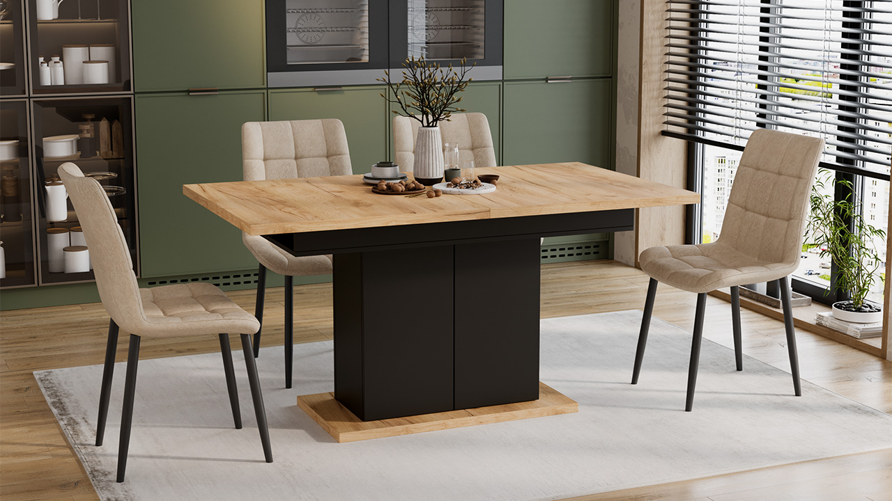 Функциональность. Стол «Детройт» Тип 1 имеет надежный ручной синхронный механизм раздвижения со вставкой, которая укладывается вручную. Это выручает в моменты прихода гостей, которых хочется разместить свободно и с комфортом. Наша новинка удивит Вас своей практичностью. Конструкция опоры этой модели предусматривает наличие ниши с полкой для хранения необходимых предметов за дверцами, открывающимися легким нажатием руки.