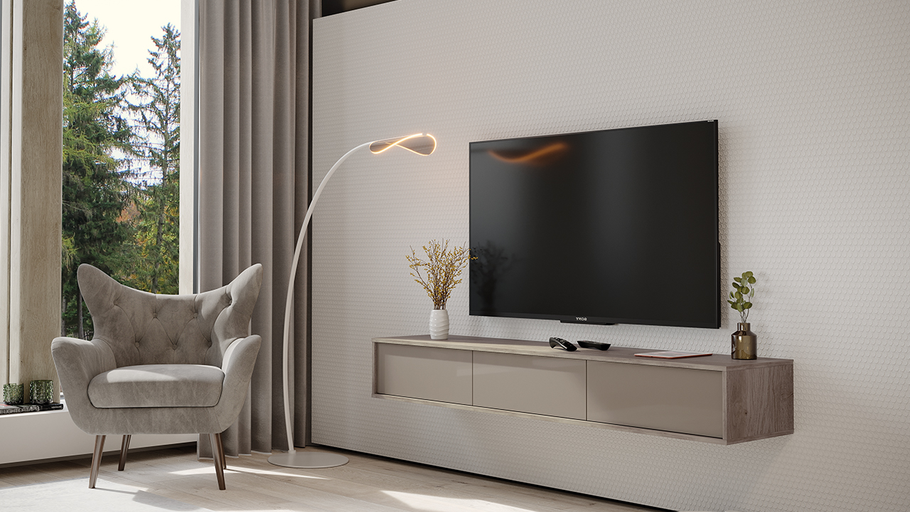 Тумба под ТВ «Эмбер» обладает геометричным силуэтом и привлекательной цветовой палитрой, превращая эту новинку в стильный модуль, который прекрасно дополнит современный интерьер гостиной.
