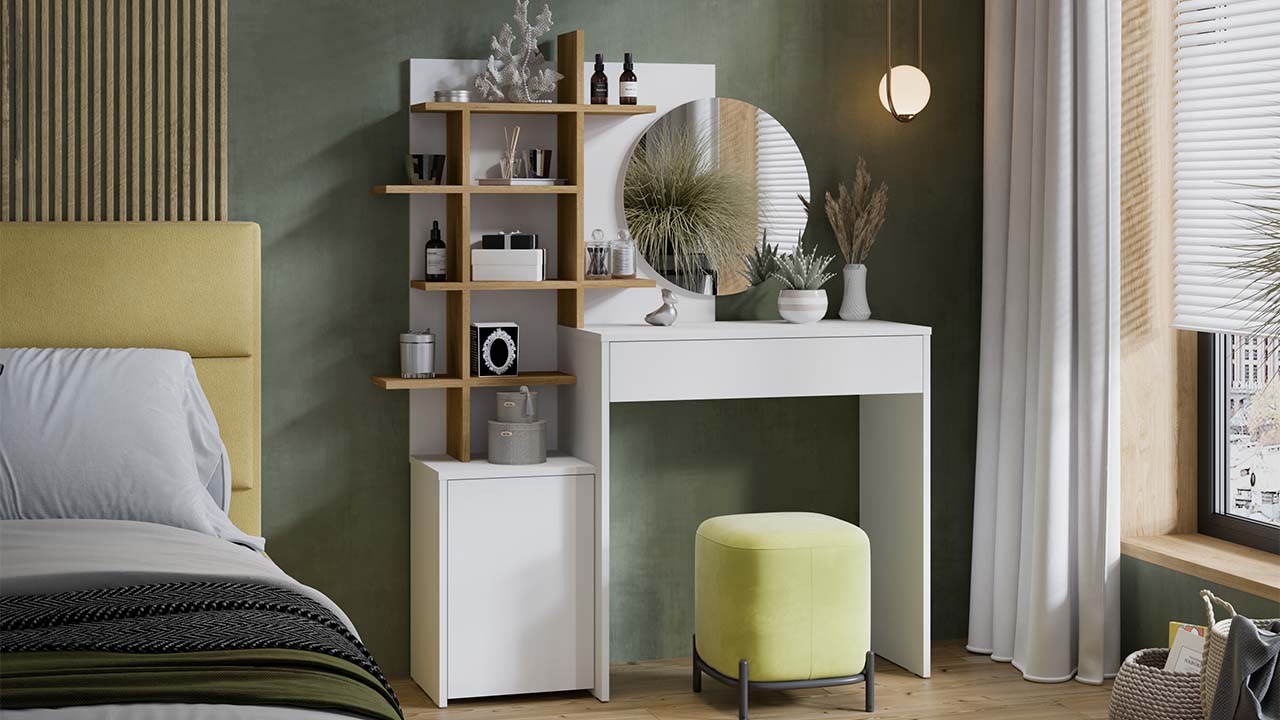 Функциональность. Помимо внешней привлекательности, стол достаточно вместителен. Конструкцией предусмотрено большое круглое зеркало, просторная столешница и практичный выдвижной ящик, который добавит места для необходимых мелочей. Стол также имеет открытые полки, которые позволят установить предметы декора, парфюм, украшения и многое друге.